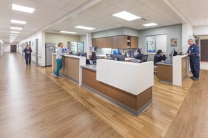 Hospitals never stop moving. From wheelchairs and stretchers to cleaning equipment and constant foot traffic, every surface gets tested daily. Durable materials reduce maintenance and downtime. Flooring that resists wear, wall finishes that don’t scuff easily and solid-surface casework can hold up for decades.